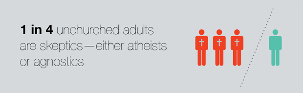 Just as believers arrive at their belief in God by amassing a variety of information and experiences, skeptics piece together different inputs to draw their conclusions. According to our research, however, it seems the three primary components that lead to disbelief in God’s existence are 1) rejection of the Bible, 2) a lack of trust in the local church and 3) cultural reinforcement of a secular worldview.