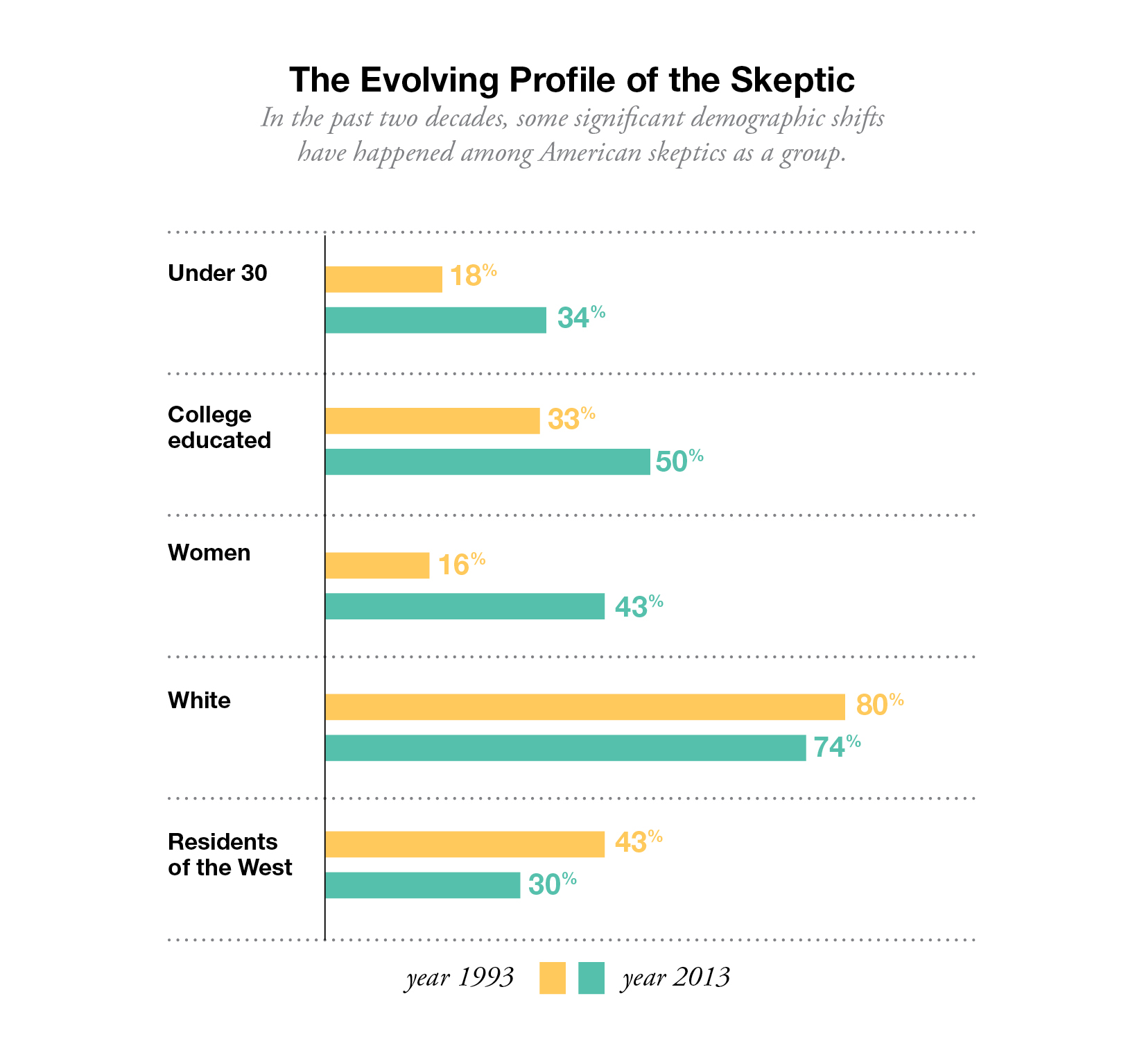 They are more educated. Today’s skeptics tend to be better educated than in the past. Two decades ago, one-third of skeptics were college graduates, but today half of the group has a college degree.