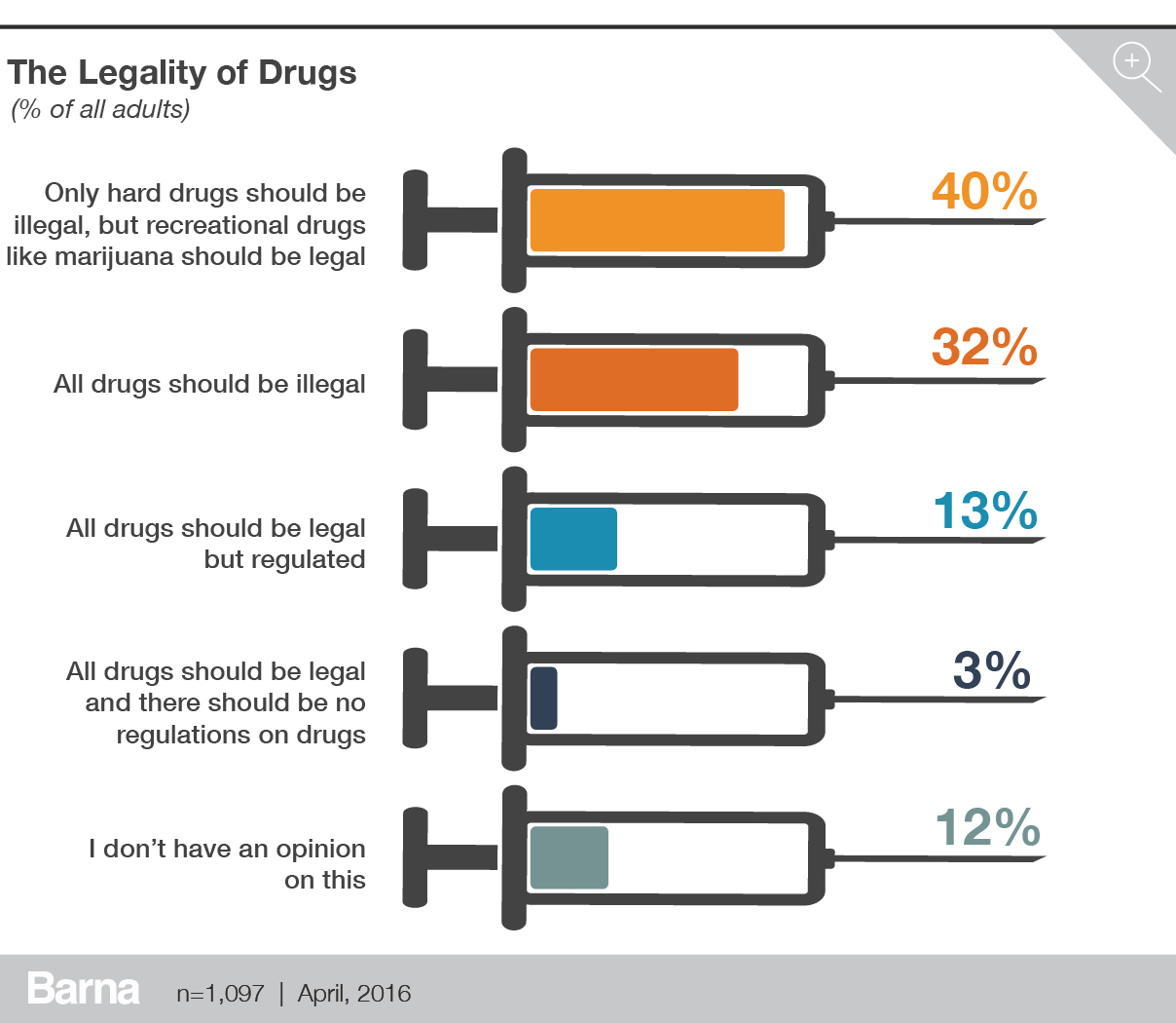 In one of Barna’s previous studies in 2014, it was found that 58 percent of adults believed marijuana should be made legal in the U.S. Though the questions were asked differently in the 2014 and the 2016 surveys—making it impossible to compare them directly—by adding together all those in the 2016 survey who believe either that recreational drugs like marijuana should be legal (40%) or that all drugs should be legal, regulated (13%) or not (3%), the total number would be 56 percent, very close to the 58 percent reported on the 2014 survey, showing a certain level of consistency when it comes to support for the legalization of recreational drugs across the country.