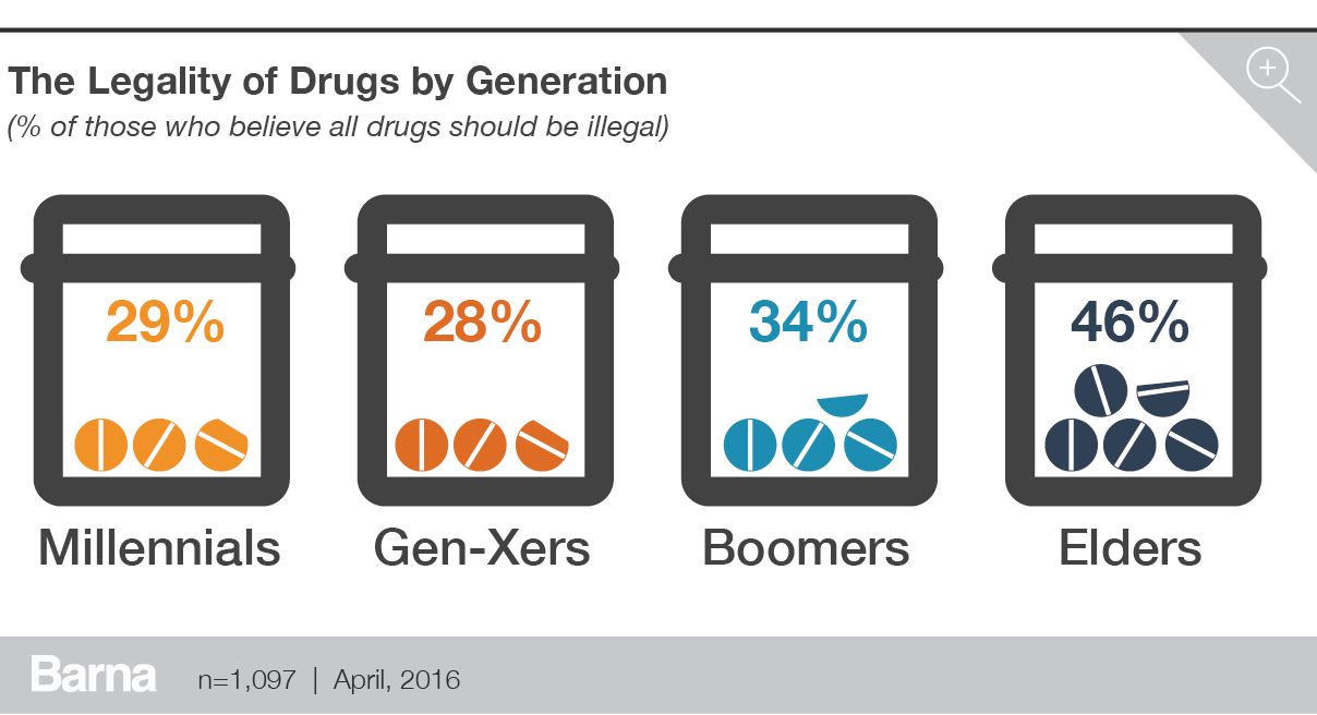 Though still an opinion held by many, the belief that all drugs should be illegal is becoming less popular, particularly among the younger generations. Less than three in 10 Millennials (29%) believe all drugs should be illegal, a view that increases in popularity with age, with nearly half of all Elders (46%) holding this belief.