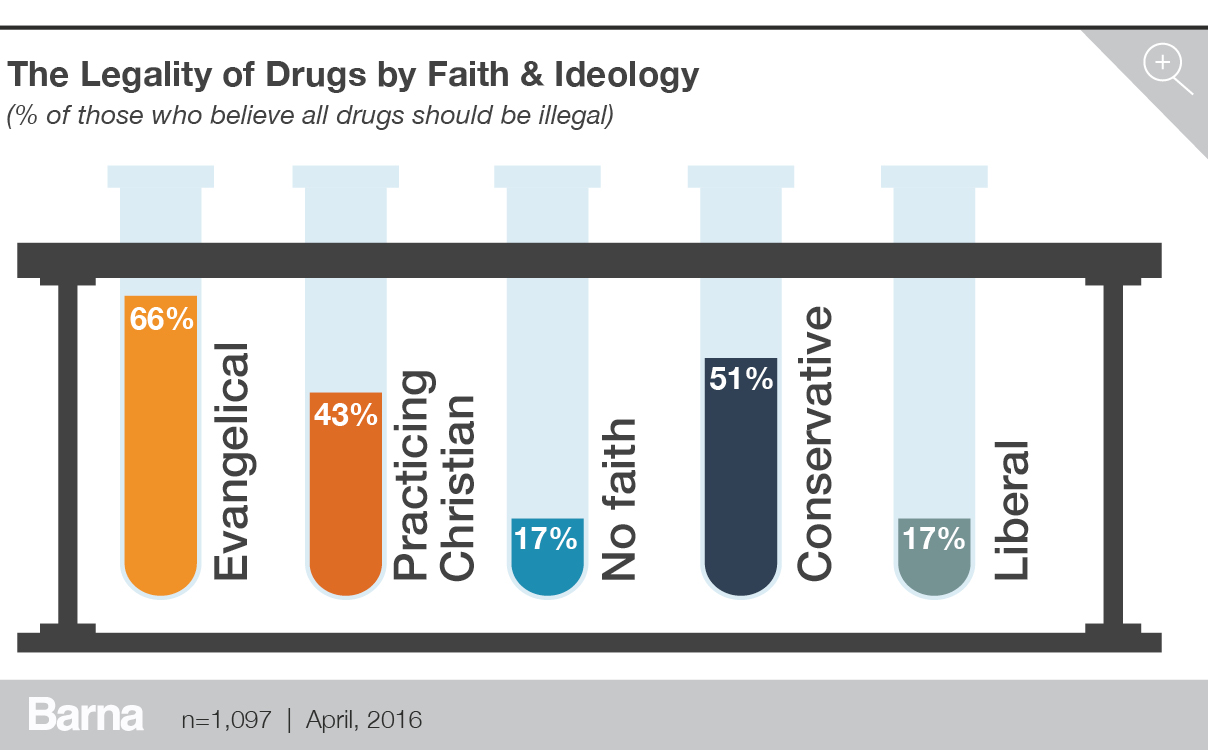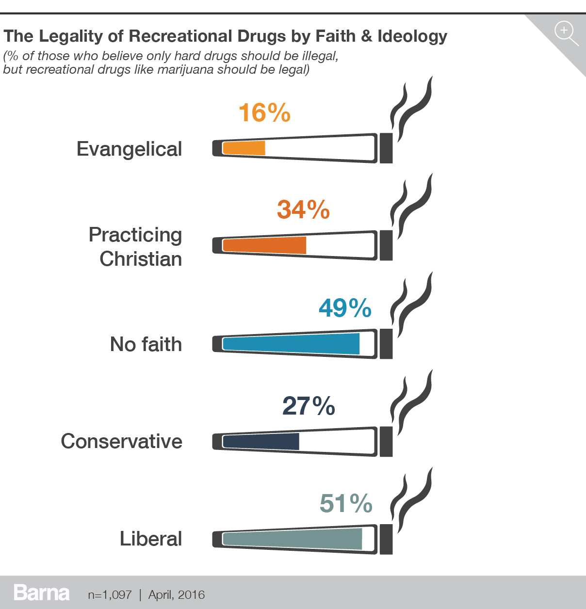 “As with so many issues of social morality, the divisions around legalizing drug use fall along generational, religious and ideological lines,” says Roxanne Stone, editor in chief of Barna and director of the study. “However, views toward recreational drug use in particular, are softening. Evangelicals and conservatives (often overlapping groups) remain most opposed to legalizing any kind of drug. This is certainly true to a religious history of abstinence from intoxicating substances. Additionally, much of the ‘war on drugs’ was framed in the context of family values—an ideology that drove much of the conservative right for the past forty years.