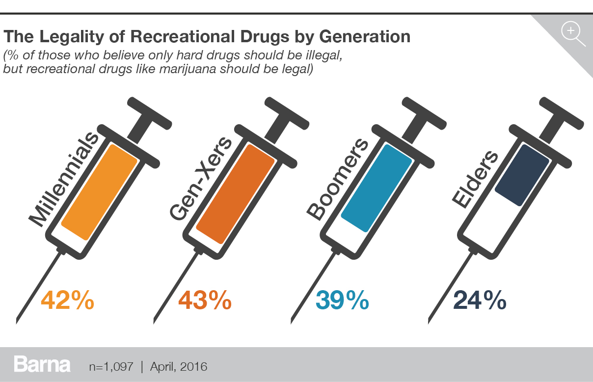 As of right now, twenty-five states and the District of Columbia currently have laws legalizing marijuana in some form. Alaska, Oregon, Washington and Colorado have all legalized recreational marijuana. Many of these laws are brand new, passing in the last five or six years. Barna’s data reflects this reality, showing that two in five adults (40%) believe only hard drugs should be illegal, but recreational drugs like marijuana should be legal. Again, the younger generations favor this view more than the older generations. 42 percent of Millennials favor the legalization of recreational drugs like marijuana, compared to only one-quarter of Elders (24%).