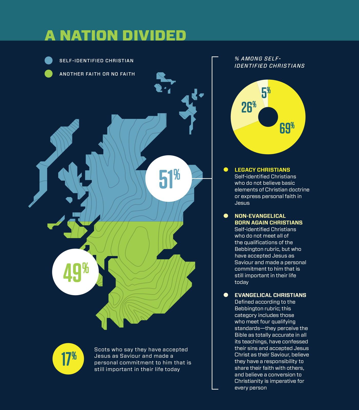 - In Scotland today, about 3 percent of all adults—5 percent of self-identified Christians—qualify as evangelical. (In contrast, 25 percent of Americans qualify under Bebbington’s definition.) Evangelicals in Scotland are much less likely than average to describe Scotland as “a Christian nation” (8% vs. 31%); rather, they tend to say that “a secular nation” (40%) or “a post-Christian nation” (44%) is a more accurate description.