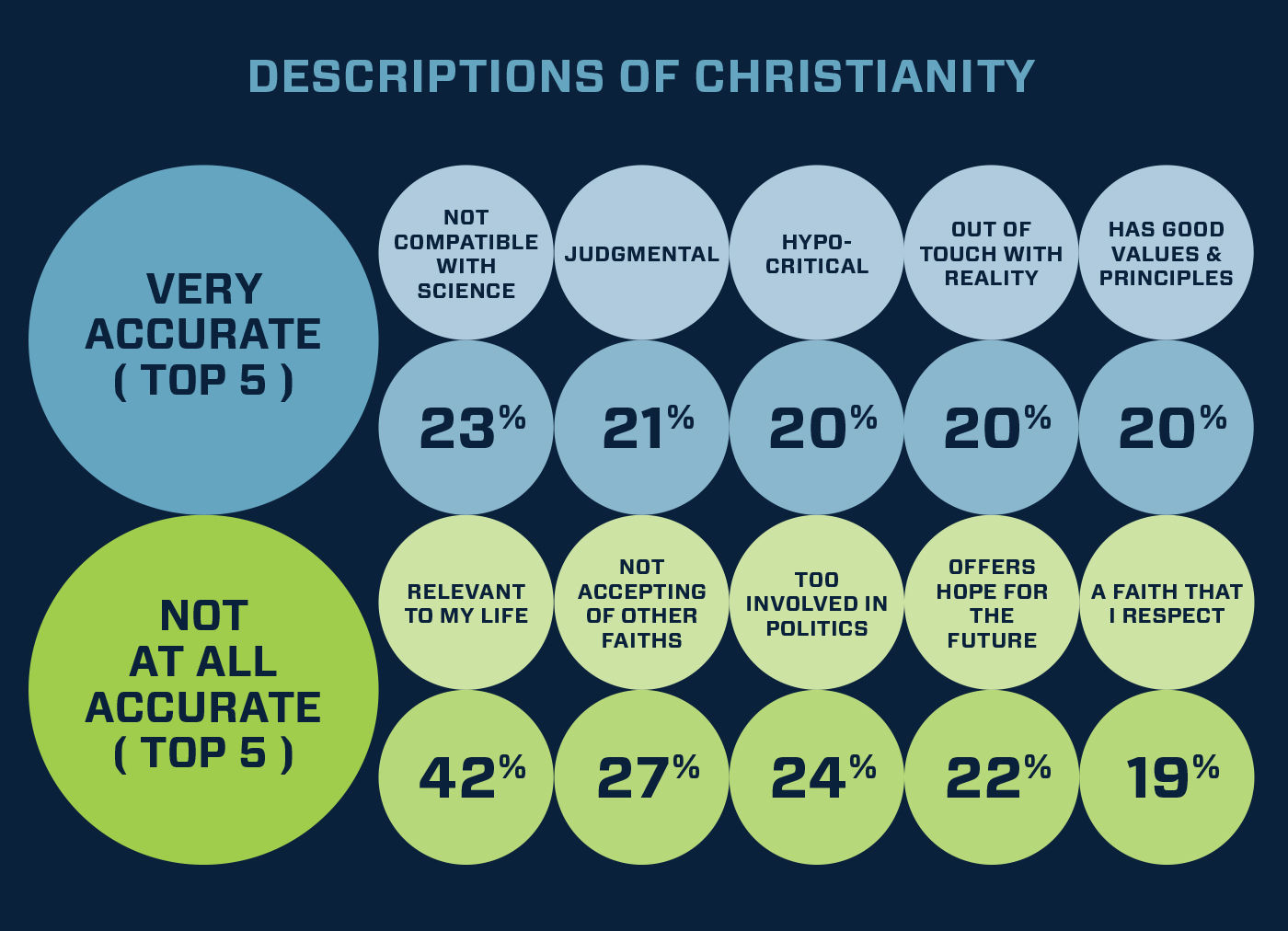 What has precipitated such declines? One clue may lie in the ways adults describe present-day Christianity in Scotland. Presented with a list of possible descriptors in the Barna research, respondents were asked to rate each on a scale from “very accurate” to “not at all accurate.” The phrases most frequently chosen as “not at all accurate” include “relevant to my life” (42%), “not accepting of other faiths” (27%), “offers hope for the future” (22%) and “a faith that I respect” (19%). Those most commonly considered “very accurate” include “not compatible with science” (23%), “judgmental” (21%), “out of touch with reality” (20%) and “hypocritical” (20%).