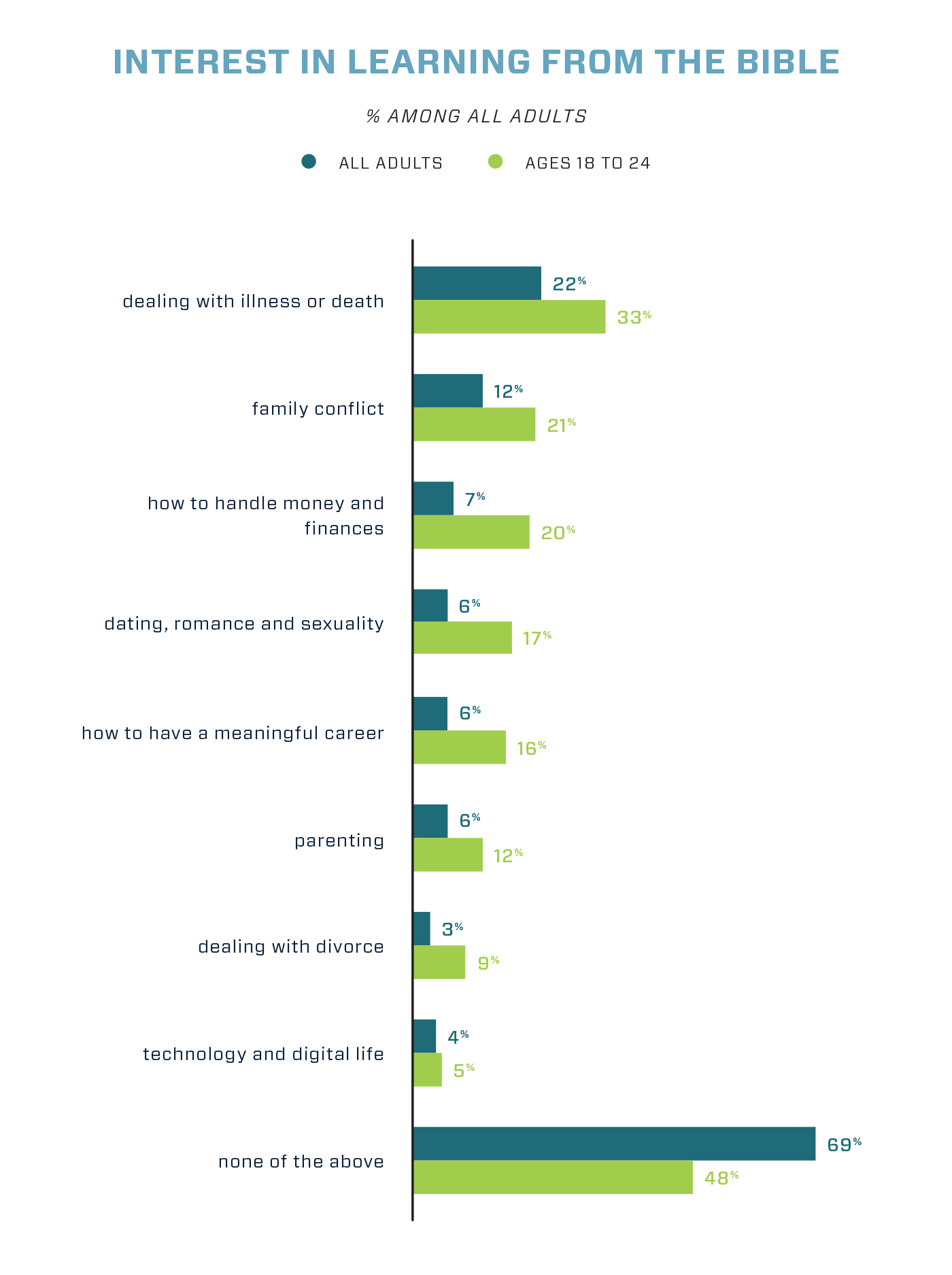 Noteworthy, as well, are the 36 percent of young adults ages 18 to 24 who hold to an orthodox view of the Bible, compared to 29 percent of all adults. They also express more interest in what wisdom the Bible offers for their lives. By the reverse token, however, young adults are somewhat more likely than the national average (32%) to understand Jesus as “just a moral teacher or prophet and not God” (37%) and twice as likely as the average (7%) to say that Jesus “was not an actual historical person” (12%). Such generational cognitive dissonance may be the natural result of few formative church experiences.